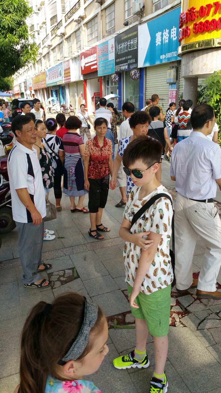 As the kids and I were on the bike it didn't take a minute to get to the actual eating place and there were many oldish people standing outside in the heat chatting. This went on for 15 minutes or so until it was determined that we should enter. Inside were about 40 tables, each seating around eight people. We appeared to be in the first 20% or so and took a table quite near the entrance with Lin Hong, her daughter Tian Tian Jie Jie, and her parents. Of course this meant that as other entered they cooed over the kids, causing a bottleneck for the rest trying to get in. I thought about moving to a more practical table, but it would have meant moving more people, so just let the situation run its natural path.